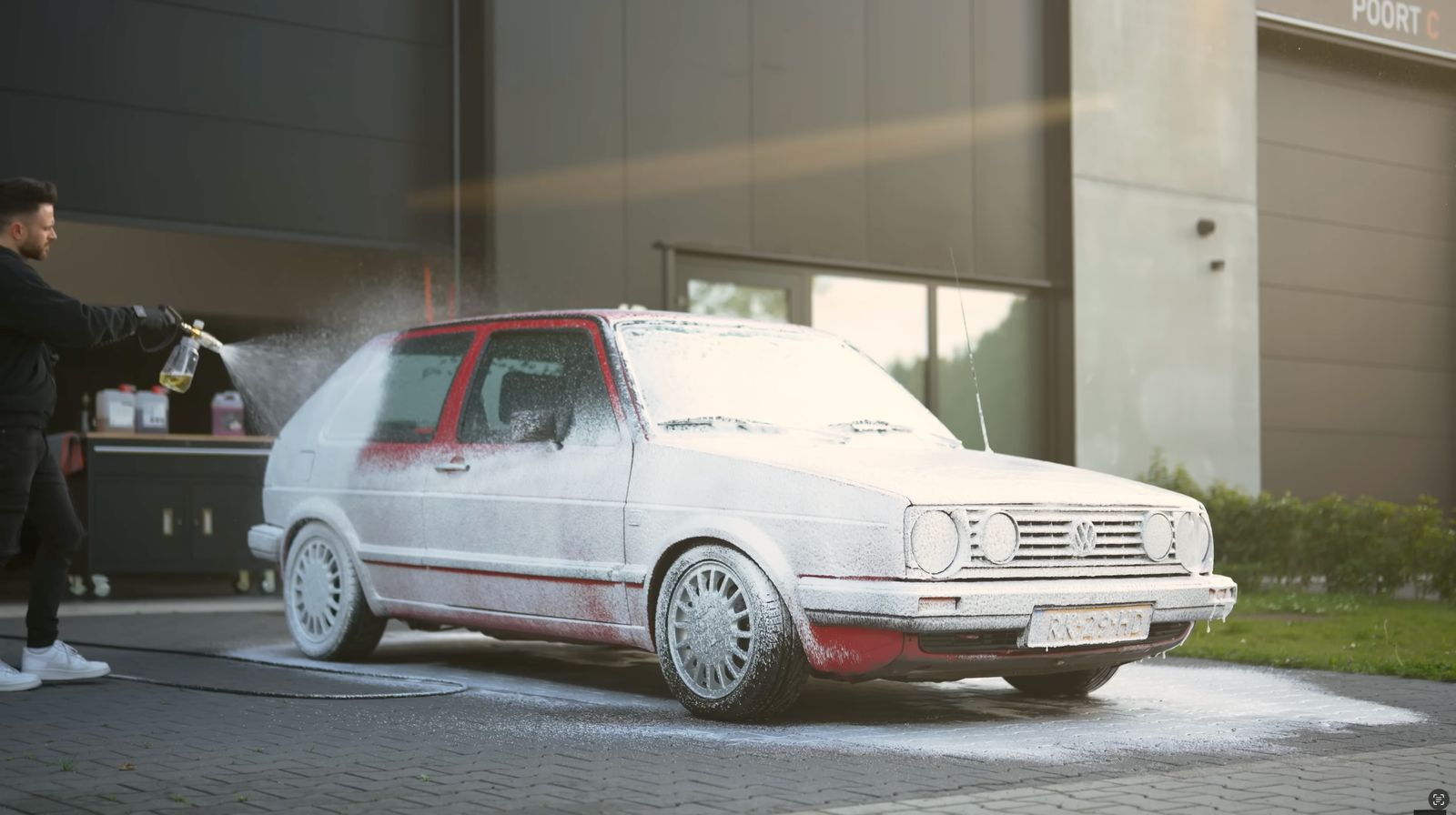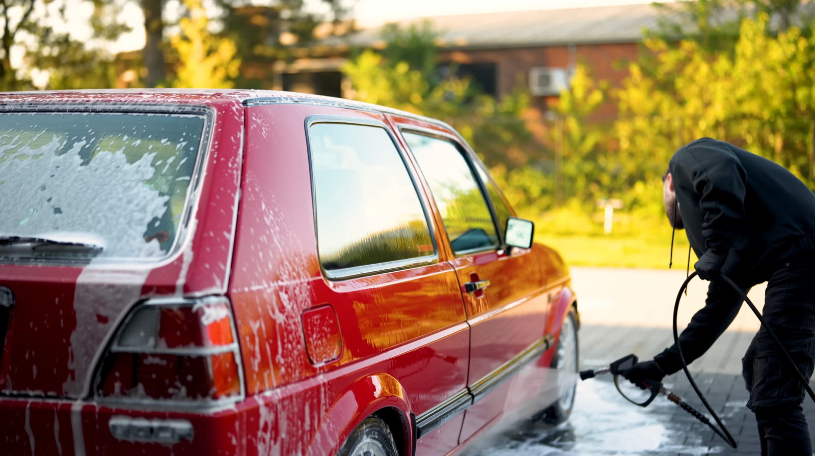 Le Procédé : Nous débutons par un prélavage à la **mousse active (Snow Foam)** qui emprisonne les particules abrasives sans toucher la voiture. Après un rinçage minutieux, nous procédons au lavage manuel selon la technique des deux seaux. Les jantes sont nettoyées en profondeur, face externe comme interne. Le séchage est effectué à l'air pulsé et avec des microfibres ultra-douces pour garantir une finition sans aucune micro-rayure.